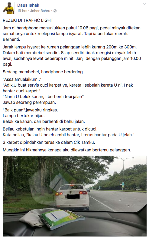"Adik,U buat servis cuci karpet ye, kereta I sebelah kereta U ni, I nak hantar cuci karpet."